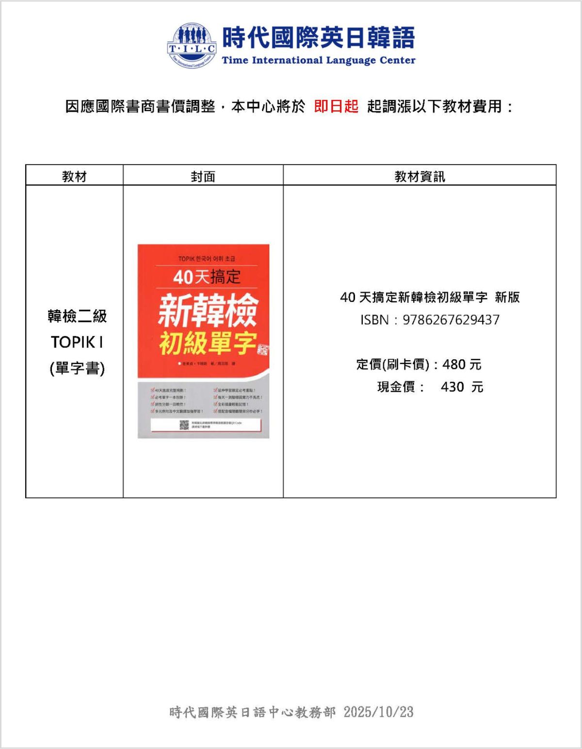 • 主旨:【因應國際書商書價調整,本中心於即日起調整韓檢二級書價】