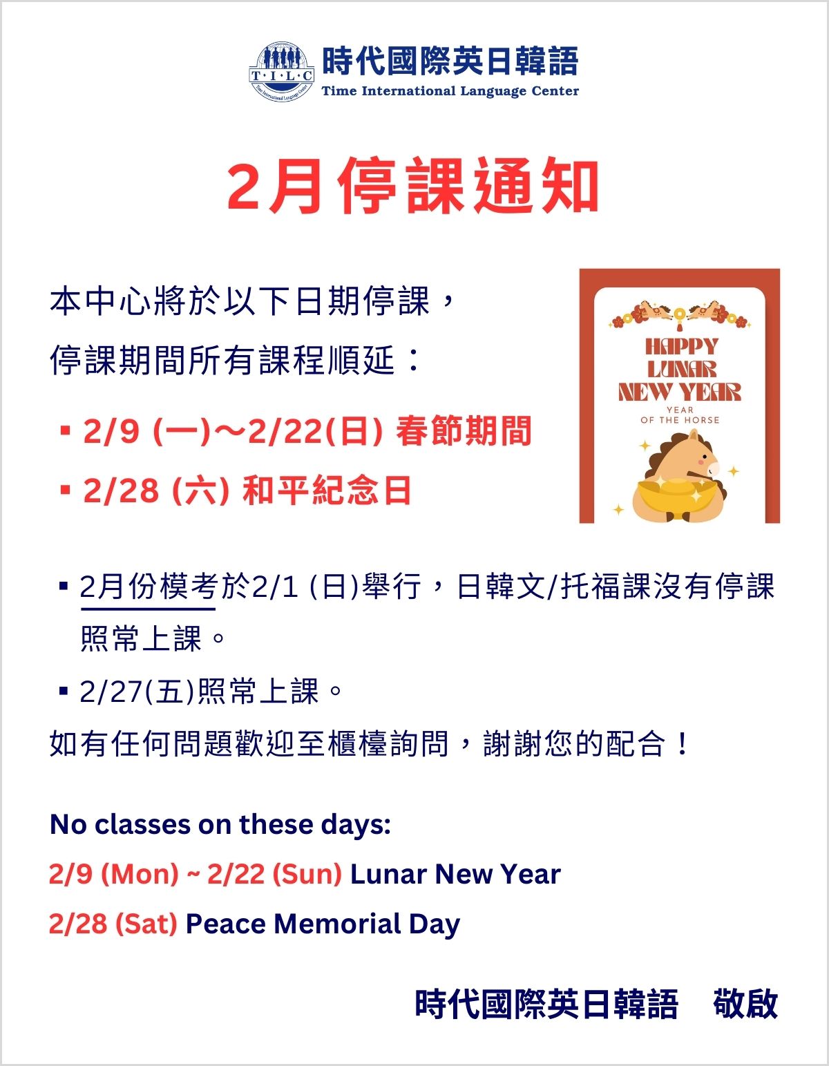 ▫ 2 月份模考於 2/1 (日) 舉行,日韓文/托福課沒有停課照常上課。