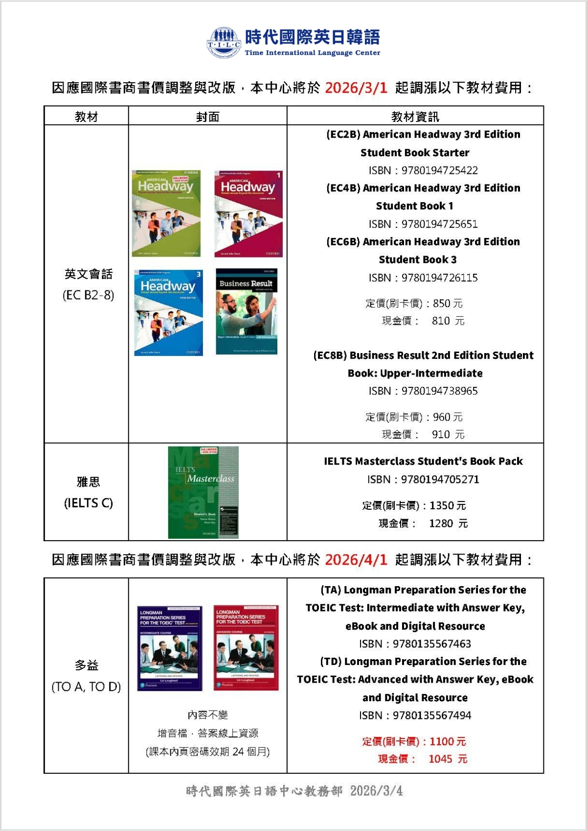 • 主旨:【因應國際書商書價調整,本中心將於3/1起調漲英文會話、IELTS C書價,4/1起調漲多益A、D書價】