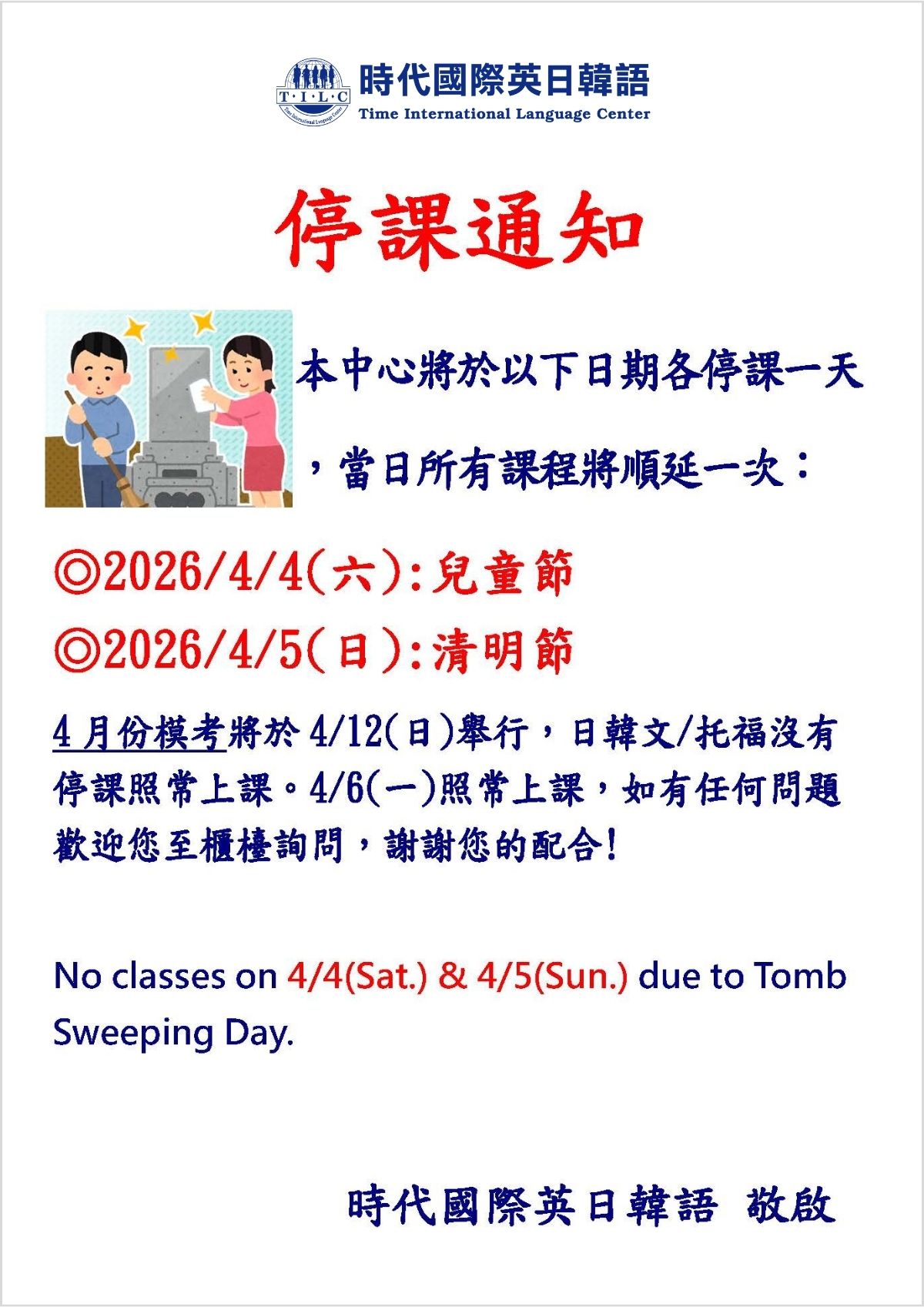 ▫ 4 月份模考於 4/12 (日) 舉行,日韓文/托福課沒有停課照常上課。